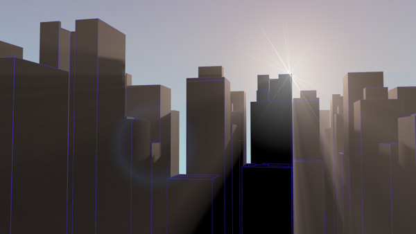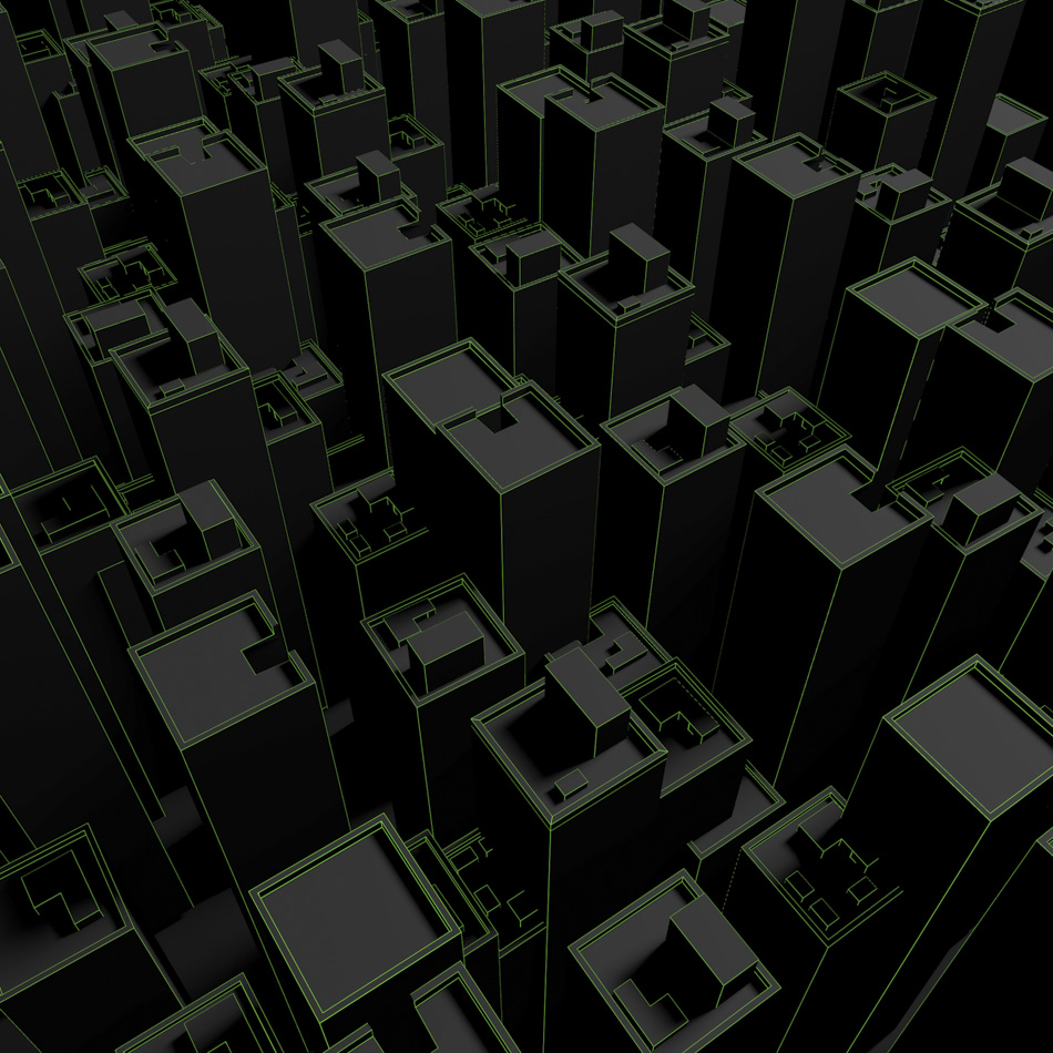 Dark city with glowing edges.