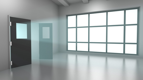 Volumetric lighting showing beam of light pour into large room from the hallway.